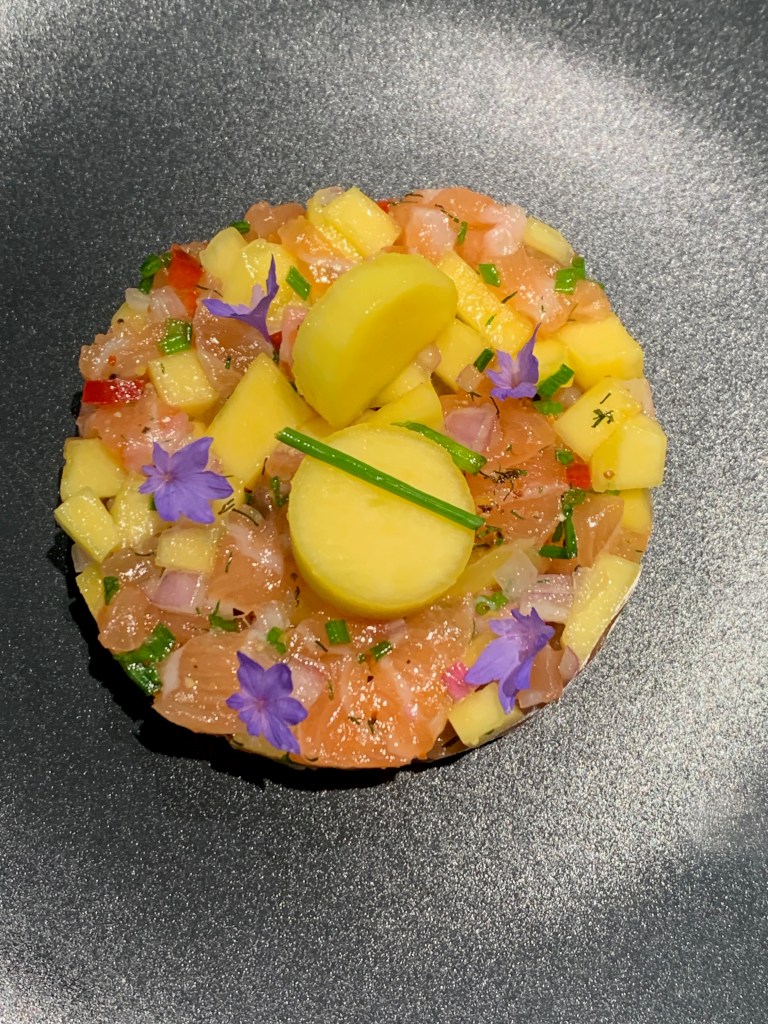 Een heerlijke tartaar van gemarineerde en verse zalm met stukjes mango, pepertje en sjalot. Lekker fris voorafje om de maaltijd te starten. Serveer met een geroosterd stukje brood en een koel glaasje witte wijn.