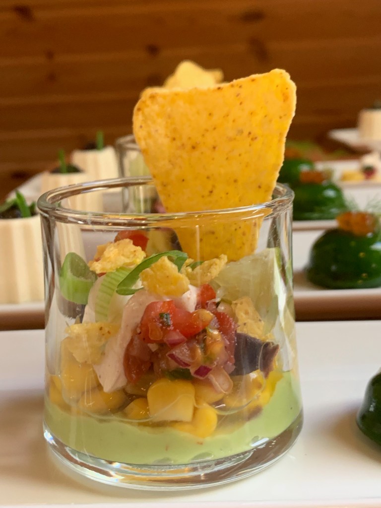 - Lepeltje gekruide zure room, stukje limoen en tot slot 1 gehele nacho chips erboven op.