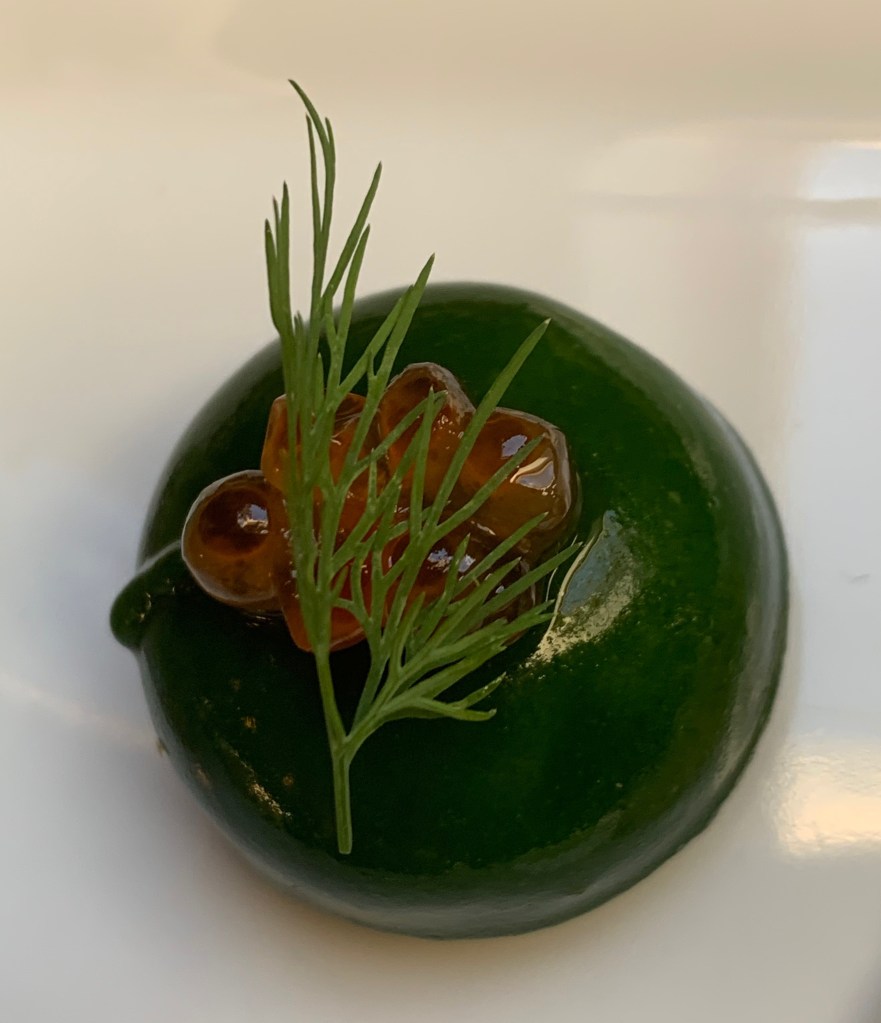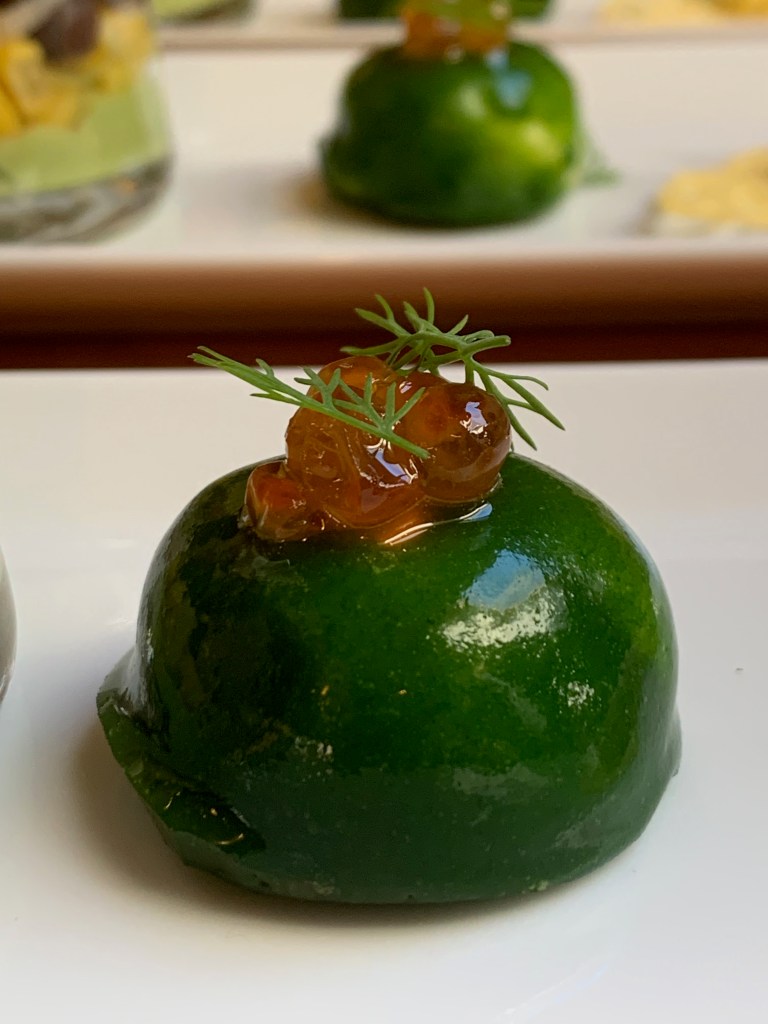 Oorspronkelijk wordt er nog een meringue van spinazie bij geserveerd, maar deze heb ik achterwege gelaten door tijdsgebrek. Maar een volgende keer probeer ik deze ook. Dit hapje maakte ik in twee dagen. Dag 1 maakte ik de mousse en het groene sap. Op dag twee maakte ik met het groene sap de gelei en werkte ik deze praline verder af. Met enkele kleine twistjes aan het originele recept, maakte ik deze heerlijke gerookte zalm mousse praline in een groen jasje.