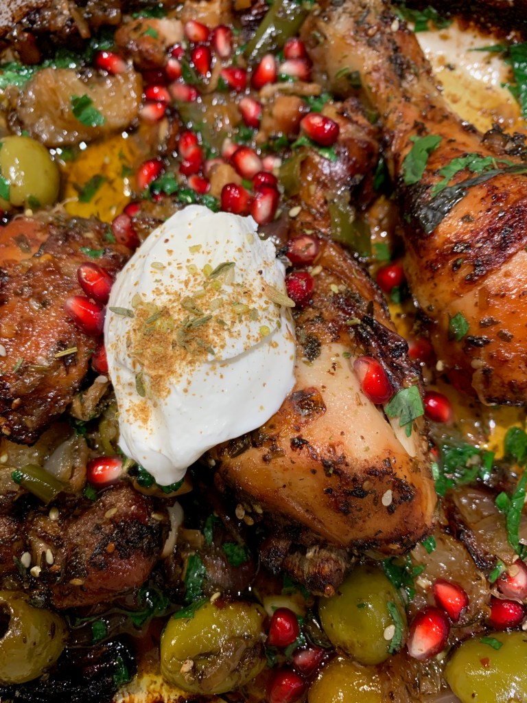 - Leg er tot slot nog een schep griekse yoghurt bovenop met wat za’atar kruiden.