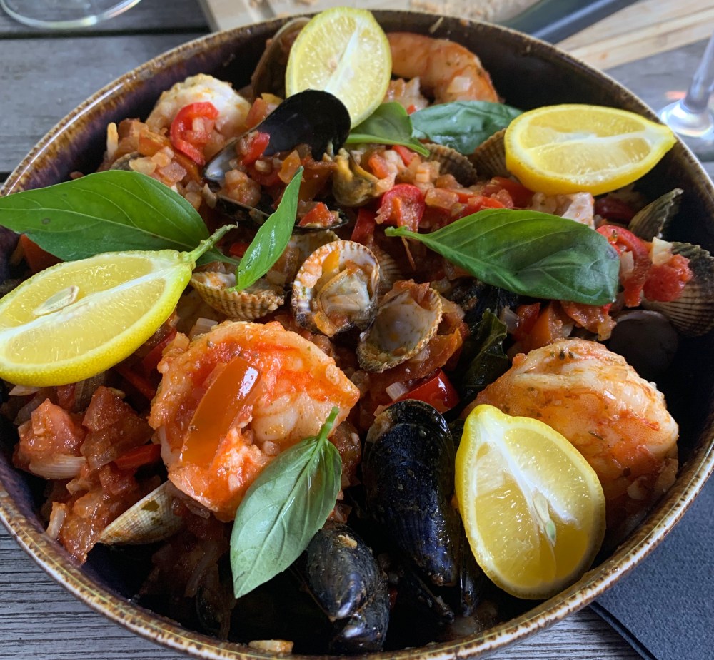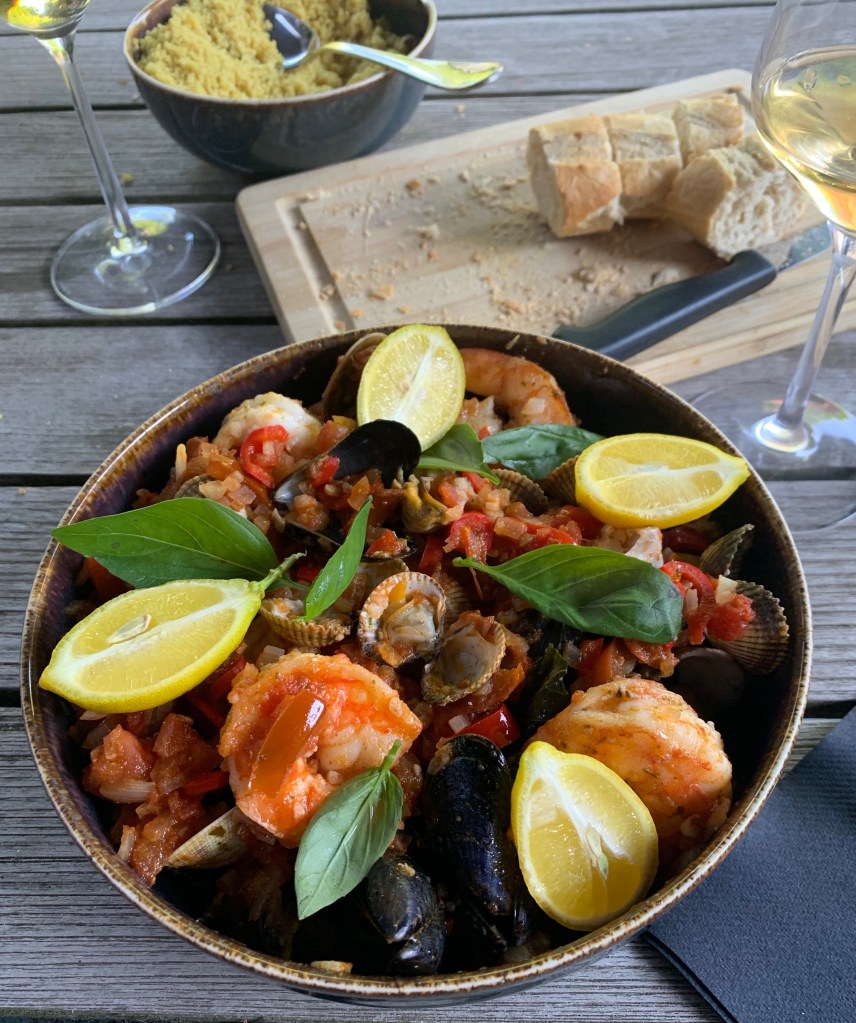 Een cataplana is een heerlijk gerecht van vis en schaaldieren, maar ook een uit koperen, dubbele pan. Deze pan wordt vooral in de Portugese keuken gebruikt. Het is ideaal voor het maken van lekkere stoofpotjes met vis en schaaldieren. Nu ben ik zelf niet in het bezit van zo’n cataplana pan. In plaats daarvan maak ik het gerecht klaar in mijn gewone wok pan met een goed deksel. De naam cataplana staat voor zowel het gerecht als de pan. Het is vooral een rijkelijk visgerecht aangevuld met tomaten en paprika. Hieronder mijn versie van dit heerlijk gerecht à là ‘Ann in de keuken’. Dien op met een sneetje brood, rijst of couscous.