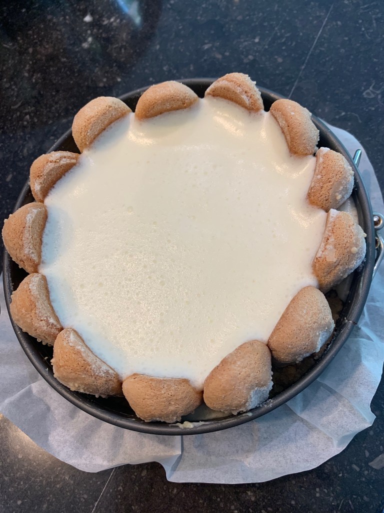 - Snij de zachte boudoirs in twee. Schik ze rechtopstaand tegen de binnen rand van de springvorm. Zorg ervoor dat de gesuikerde kant naar buiten is gedraaid. Zet ze vast in de koekjes bodem.