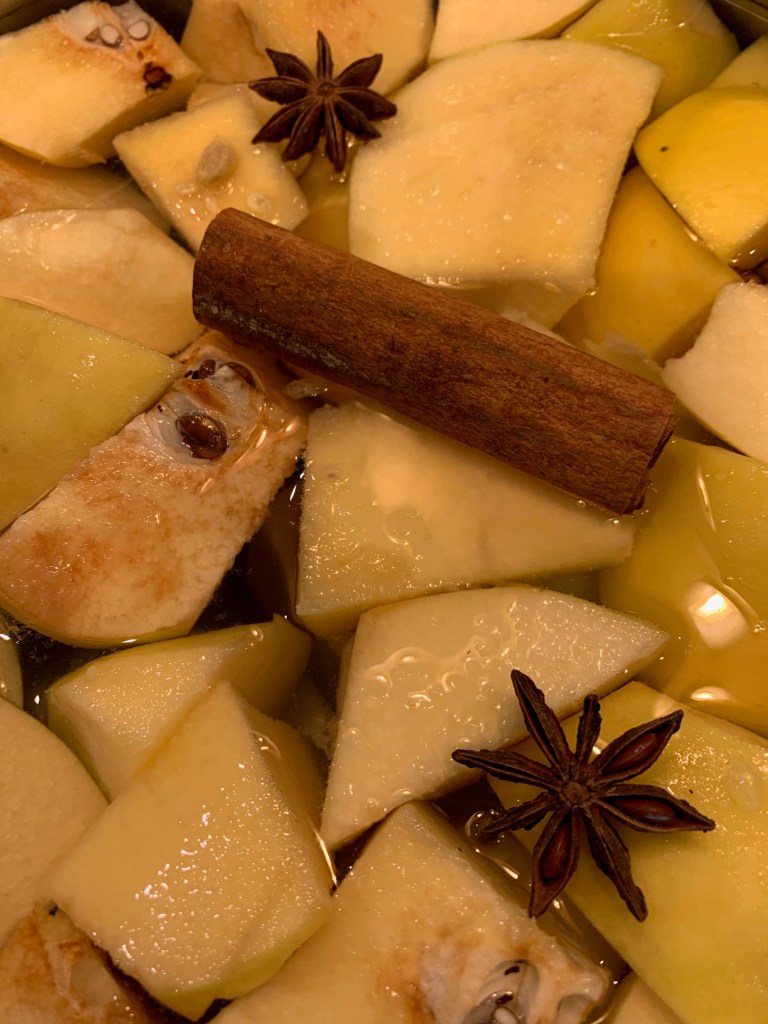- Snijd de kweeperen in 4, ongeschild en met het klokhuis. Verwijder wel het steeltje en een deeltje onderaan.