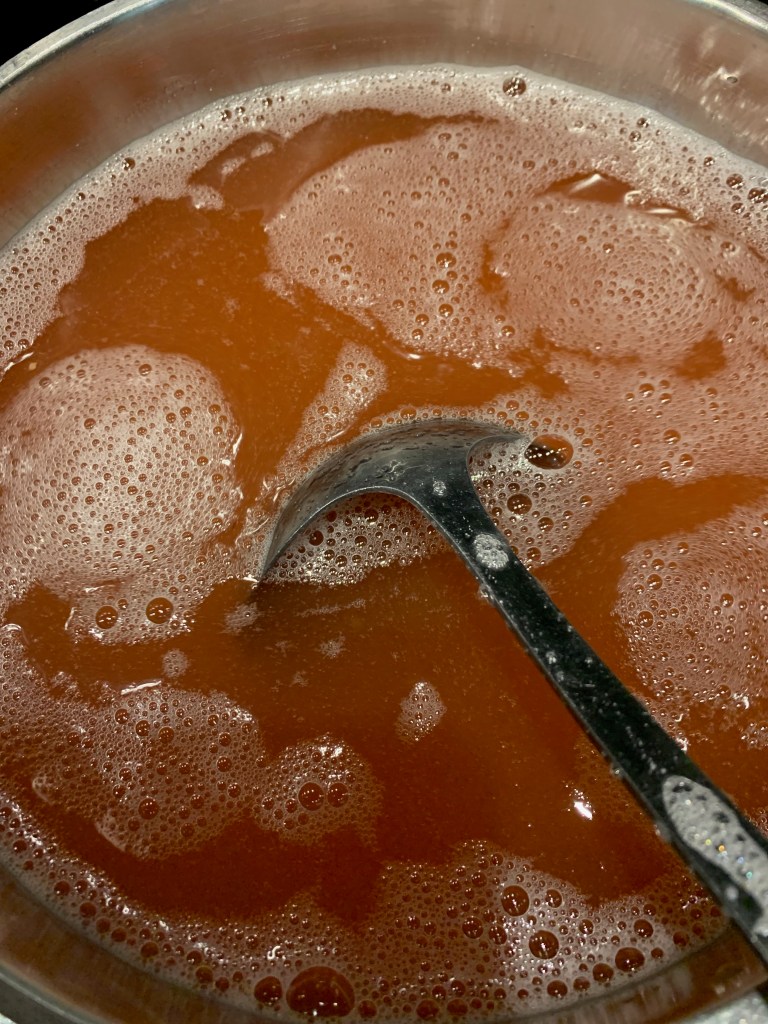 - Meet 1 liter sap af en breng aan de kook. Voeg de geleisuiker toe. Deze die ik gebruikte was 500g op 1 l sap. Maar kijk op de verpakking van jouw suiker.