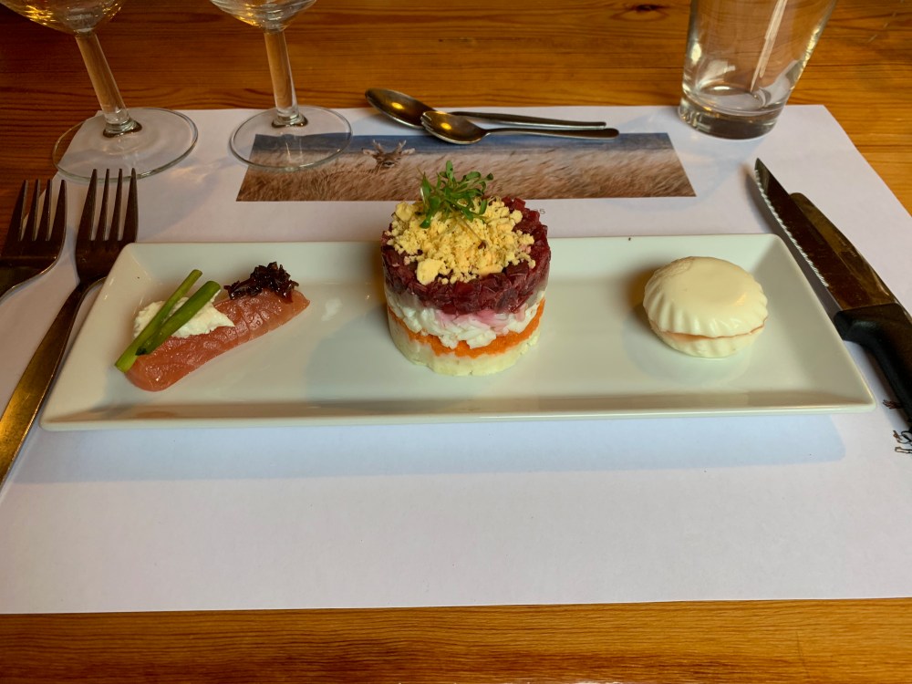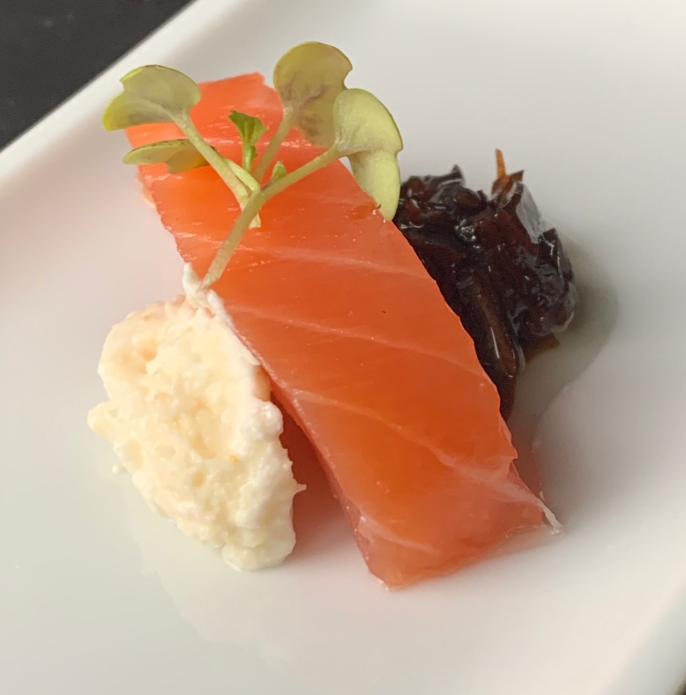 - Leg op een bordje een stukje gerookt zalmhaasje per persoon, lepel er wat mierikswortelroom en sjalottenconfijt bij.