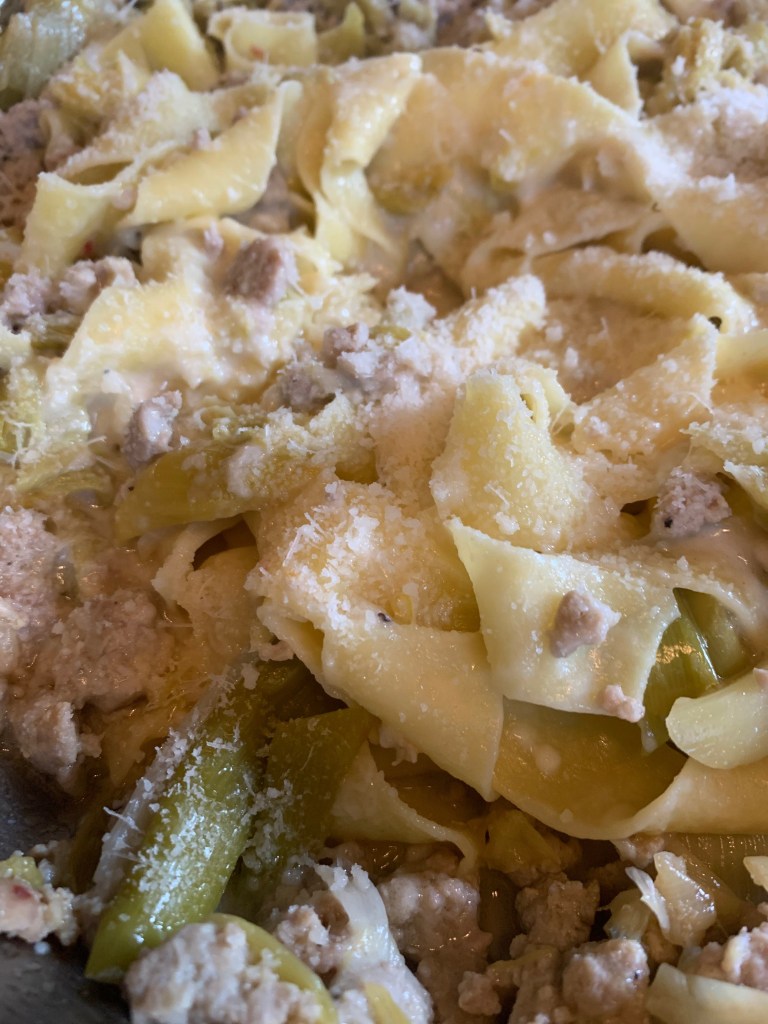 Houden jullie ook van prei en kaas ? Het is een combinatie die me steeds bevalt. Zo was deze pastaschotel met pappardelle, zacht gestoofde prei, rul gebakken gehakt en parmezaan een schot in de roos. Het gerecht staat snel op tafel en geloof me de bordjes zullen leeg zijn 🙂 Comfortfood op zijn best.