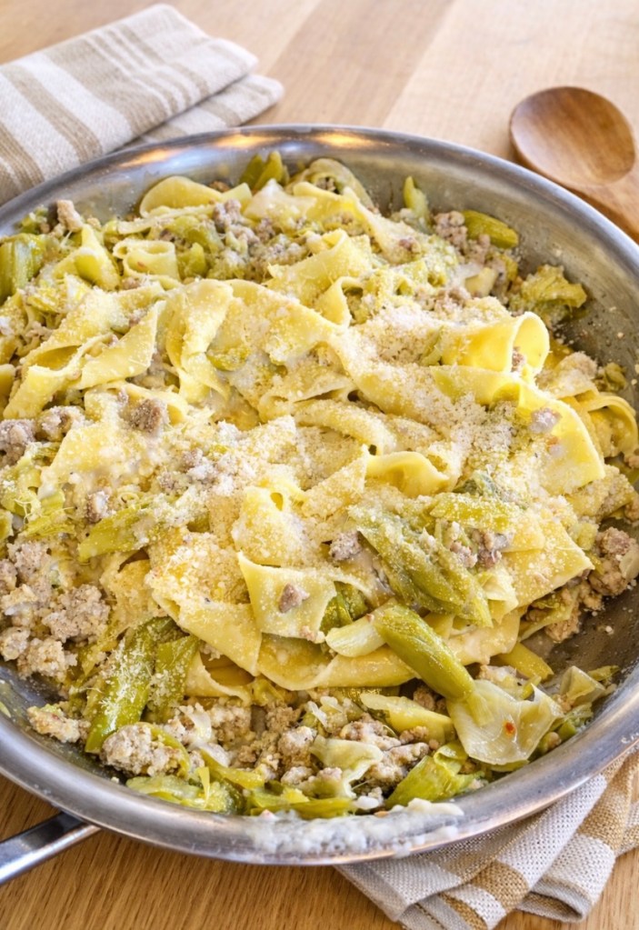 - Giet de pappardelle af en voeg bij de prei en gehakt, zet op een zacht vuur en laat kort samen stoven.