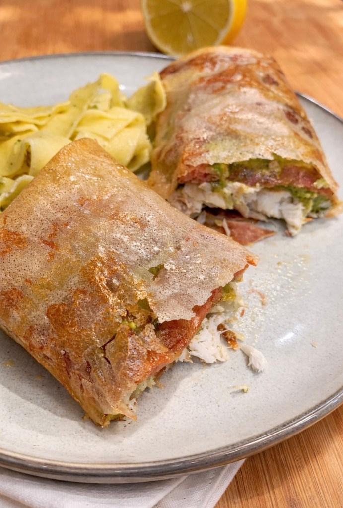 - Leg hierop de gebakken schelvishaas op en vouw het brickdeeg dicht.